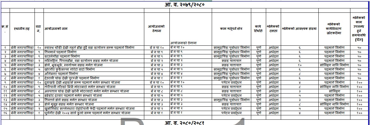 बेनी नगरपालिकामा सूचिकृत भएका ९ सय ९६ जना वेरोजगारहरु मध्य पछिल्लो ३ वर्षमा ३ सय ५१ जना जना सूचिकृत वेरोजगारलाई पदमार्ग निर्माण र सडक सोलिङकागरी ६० वटा वटा योजनामा २ सय २८ दिन रोजगारी उपलब्ध गराएको रोजगार शाखा (केन्द्र)को तथ्याङ्कमा उल्लेख छ ।