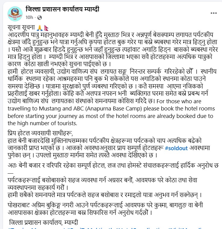 मुस्ताङमा मात्र होईन, प्रवेशद्वारमा पर्ने म्याग्दी सदरमुकाम बेनीदेखी बेनी–जोमसोम–कोरला सडक किनारामा पर्ने सवै होटल, सडक नजिक पर्ने वस्तीका होमस्टे, होटलहरु सवैमा पर्यटक नअटेपछि म्याग्दी र मुस्ताङ्गका जिल्ला प्रशासन कार्यालय र होटल ब्यवसायी संघले सूचना जारीगरी होटल वुकिङ छैन भने पोखरा वा बाग्लुङ्गमै बास बस्न आग्रह गरेका थिए ।
