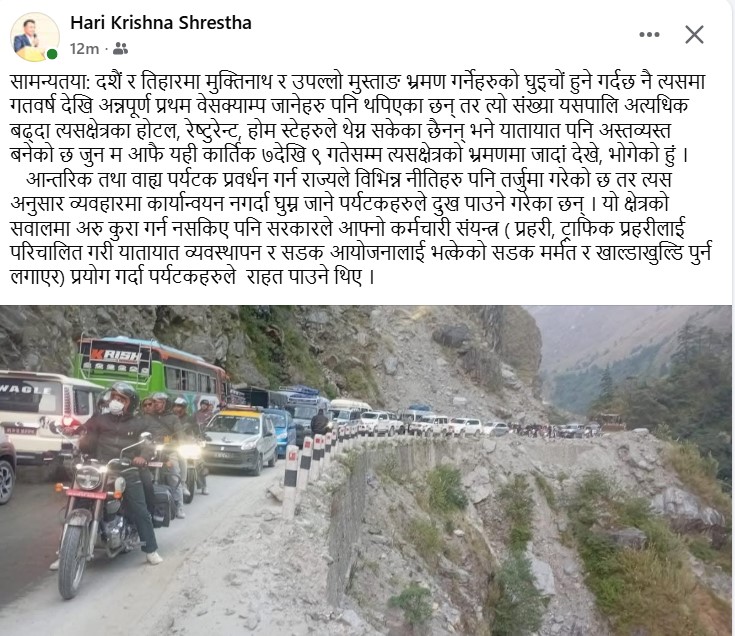 ‘सहज यात्रा नहुँदा यात्रु/सवारी साधनहरु समयमै गन्तब्य पुग्न पाउँदैनन, निक्लने पनि समयमै निक्लन नपाएपछि विचमै बास बस्नु पर्ने बाध्यता आई परेपछि होटलमा बास ब्यवस्थापन थप चुनौति भएको हो’ बेनीका पुराना होटल ब्यवसायी समेत रहेका एमाले नेता हरीकृष्ण श्रेष्ठ भन्छन, ‘राज्यका प्रहरी, ट्राफिकहरु सडक ब्यवस्थापनमा खटिने र सडक विभागले पनि समयमै सडकमा साधारण मर्मत सुधार गरिदिने हो भने, समस्या दोहोरिने थिएन ।’