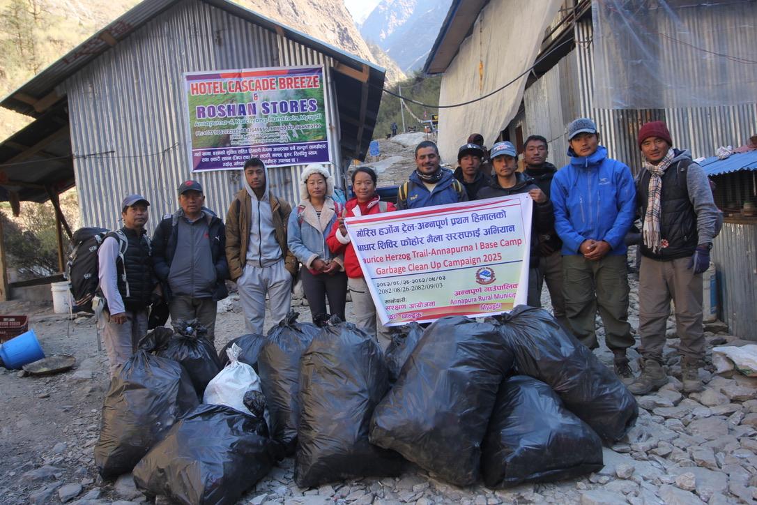 अन्नपूर्ण प्रथम हिमाल आरोहण मार्ग तथा पञ्चकुण्डहिमताल पुग्ने मौरिस हर्जोग पदमार्गमा पदयात्रीले फालेका फोहोर संकलन गरिएको छ ।